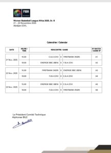 Déjà sur place à Abidjan en terre ivoirienne, l’équipe d’Energie Bbc qui prendra part aux éliminatoires de la Women Basketball League Africa 2025 qui se tiendra du 21 au 23 novembre 2025, est désormais fixée sur ses adversaires et le format de la compétition. En effet, quatre équipes participeront à ce tournoi qui se jouera de façon linéaire. Il s’agit de Friends Basketball Association (FBA) de la Côte d’Ivoire, Club Sportif d’Abidjan de la Côte d’Ivoire, FirstBank du Nigeria et Energie Bbc du Bénin. Ainsi, toutes les équipes se rencontrent avec les trois autres équipes en aller simple. Les deux (2) meilleures équipes les mieux classées sont qualifiées pour la phase finale qui aura lieu au Caire en Egypte du 05 au 14 décembre 2025. Et pour son entrée en lice, le club de la SBEE affronte ce 21 novembre 2025 FBA de la Côte d’Ivoire dans un duel qui s’annonce épique. Il revient au coach Oswald Quenum et ses joueuses de rester solides et de ne pas manquer ce début de compétition. L’équipe qui avait fignolé son plan avant son expédition en terre ivoirienne semble être prête pour aller à l’assaut de ses adversaires. « C’est ma deuxième participation à cette compétition. On peut espérer une place qualificative pour la phase finale. Donc, rester parmi les deux meilleures équipes », a déclaré le coach d’Energie Bbc, Oswald Quenum.